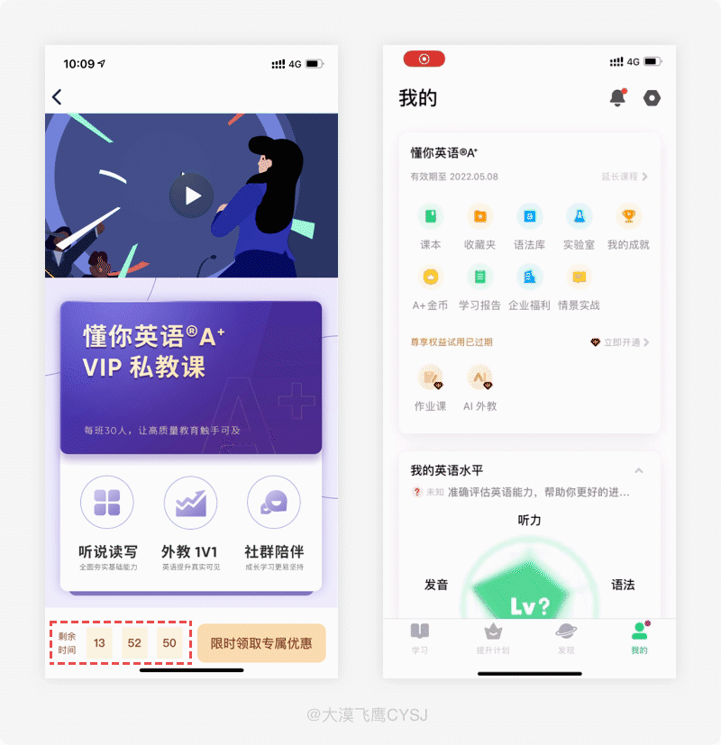 流利说·英语有很多零碎的优质AI课程,在本身价格就很便宜的基础上依然启用了限时优惠,但不同的是用户每日首次进入都有以毫秒为最小单位的15分钟倒计时,本身时间就短暂,加上毫秒以飞快的变化速度尤为显眼,若盯的时间稍长,多少看的心里有些发慌。因存在优惠的缘故, 用快速跳动的数字鼓动用户内心贪婪的欲望, 其焦点在于利用紧张的时间强调此优惠课程在未来的不可得性,防止用户花很多的时间做出决策,推动用户马上做出对平台有利的决定, 暗示其尽快购买该课程达到促销的目的。