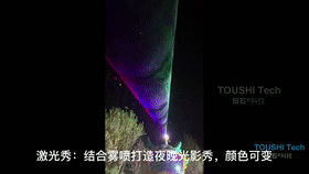 投石科技采用8W-15W全彩动画激光灯,固定在雕塑顶部,通过激光控制器支持输出最高120Kpps振镜扫描信号,支持6通道激光颜色射出,结合雾气实现极光效果。