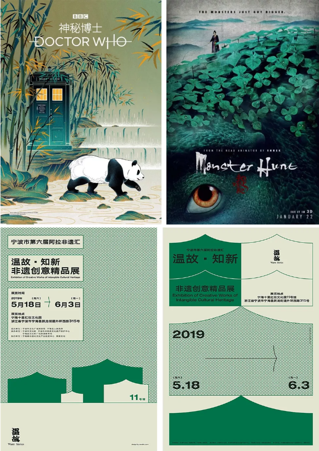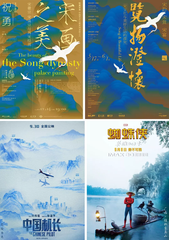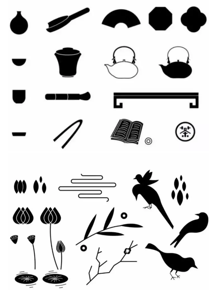 除了以上提及的水墨书法、传统纹样之外,还有其他中国元素。例如手工艺、服饰、特色食品、传统戏曲、乐器、动植物类等扁平写实图形,这些都能运用到设计当中。