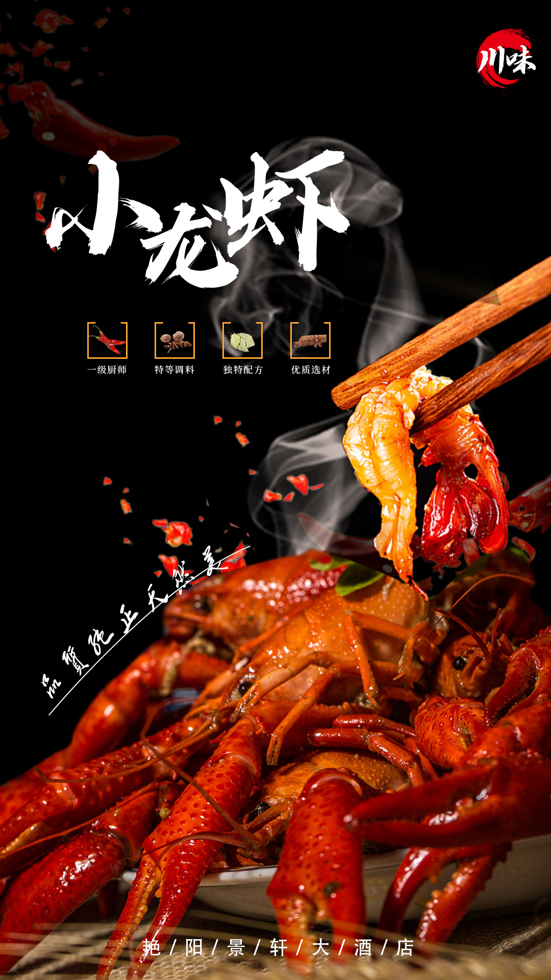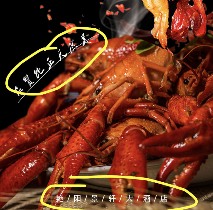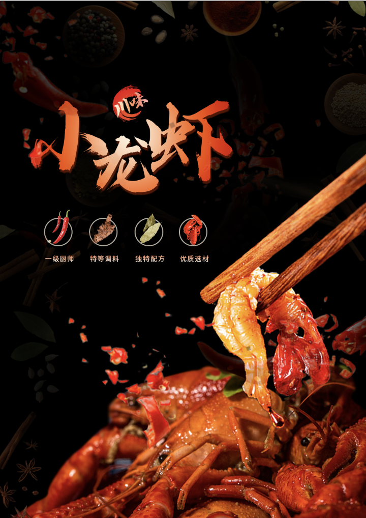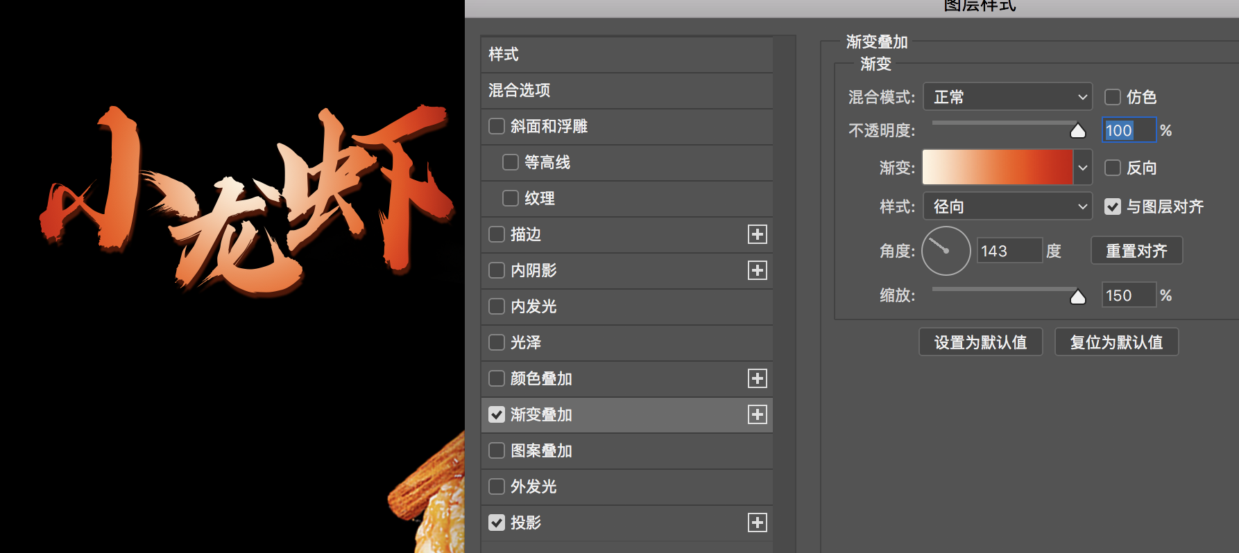 主标题的文字是纯白色,为了进一步与画面协调,可以添加渐变色(选择龙虾的颜色);添加投影效果,可以使文字具有厚度;