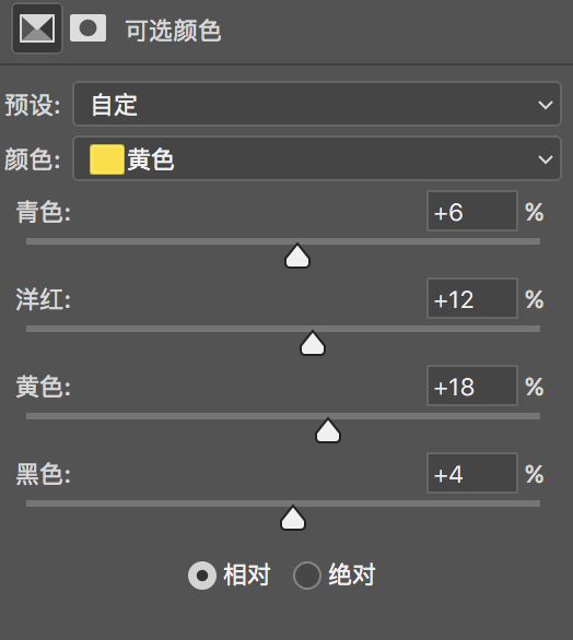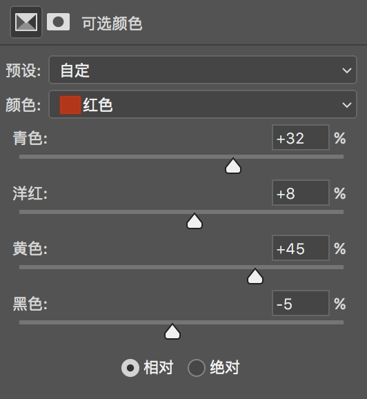 a. 添加“可选颜色”,微调“红色”和“黄色”通道,如图: