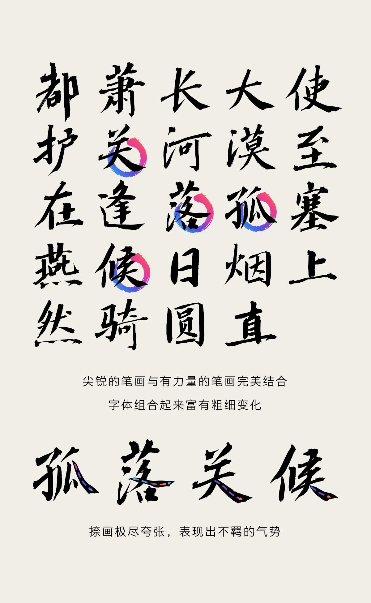 设计师灵兔:“这款字体的灵感来源于我在一次写王昌龄《出塞》这首诗的时候,为了表现边塞战场的辽阔肃杀,荡气回肠,在立足于传统书法的结构和用笔基础之上,对笔画造型以及行笔上做了一些探索,与传统书法讲究藏而不露不同,该字体将毛笔的运动过程突出表现了出来,让文字显得更为灵动。起笔收笔更为利落,有潇洒之感。”