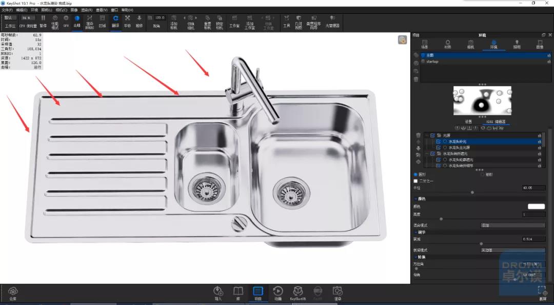 08、回到环境面板,进一步对画面光效进行处理。这次我们要制作整个环境的主光源,先从水龙头的亮面开始,确保这里是产品中最亮的地方,增强画面层次感。