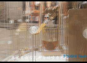 投石科技多机联动控制装置被安置在上海新世界大丸百货雪花秀时光锁鲜舱限时快闪店门口。一个透明的半圆形橱窗用于展示该品牌的香水产品。这套装置只需要一键按下白色按钮即可触发三个装置同时运作,分别是自动喷香水机、自动吹海洋球装置、灯光联动装置。