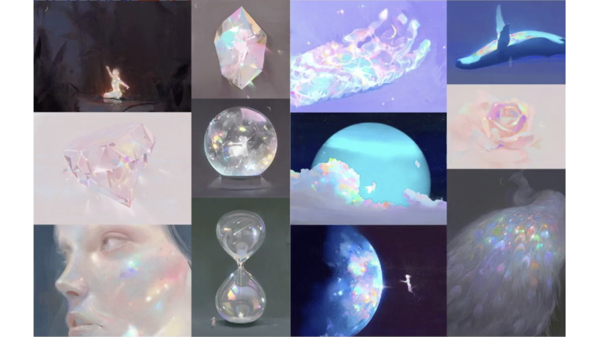 这组作品,中下游的个人风格开始确立了,添加了五彩斑斓的颜色。这个风格其实来源于石头「欧泊」,一种流光溢彩的石头。黑暗中有一些流光溢彩,每个人虽然都很渺小,但都有发光的时刻。你可以在画面中感受到毁灭与希望并存的感受。