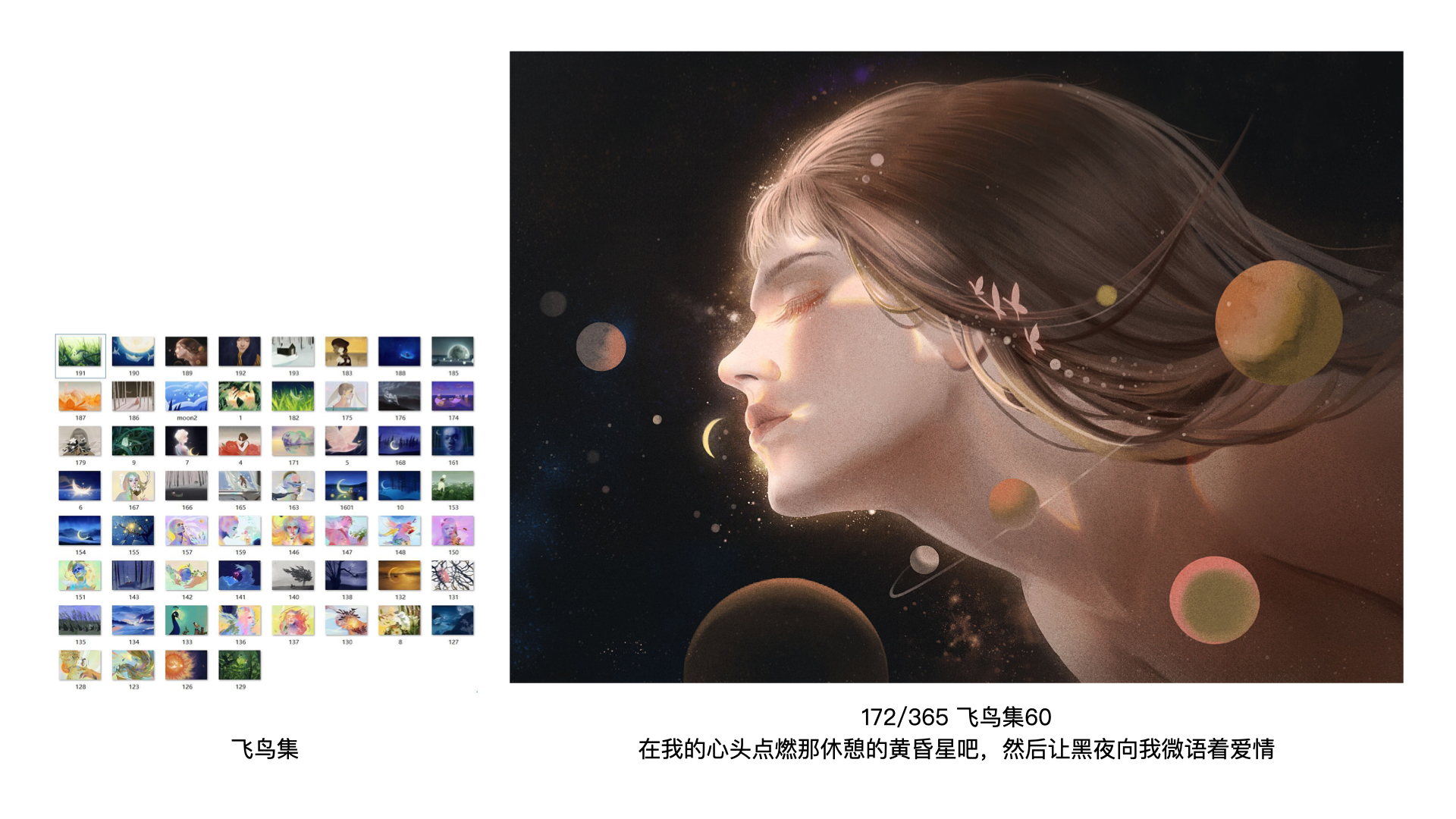 这一组的灵感来源于《飞鸟集》。比如这幅画,从泰戈尔的这句诗出发,提取了微语与爱情两个关键词,用星空表达黑夜,用人亲吻月亮传达情感,并笼罩着光,整体画面呈现为静谧与安静的感觉。