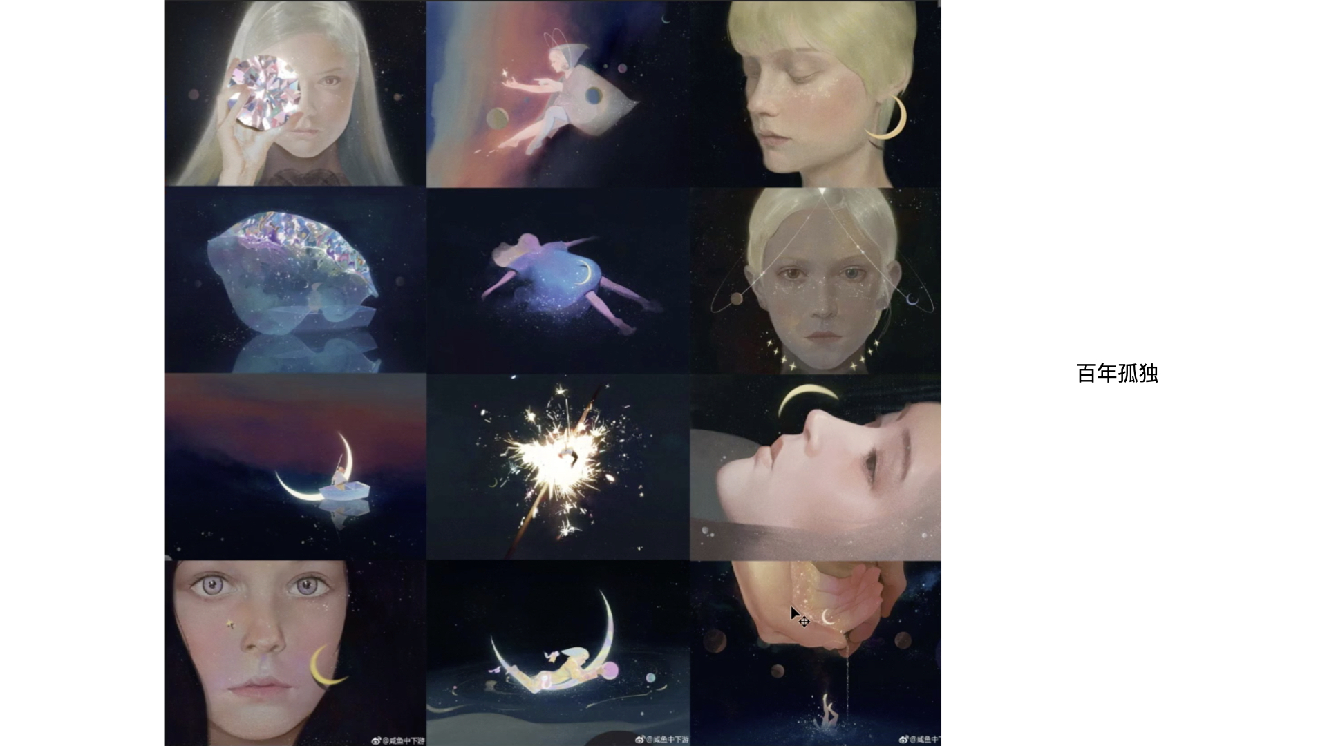 到百年孤独这组,插画师有了自己想表达的东西 —— 孤独但有希望,在整体暗淡的画面中添加了微光。