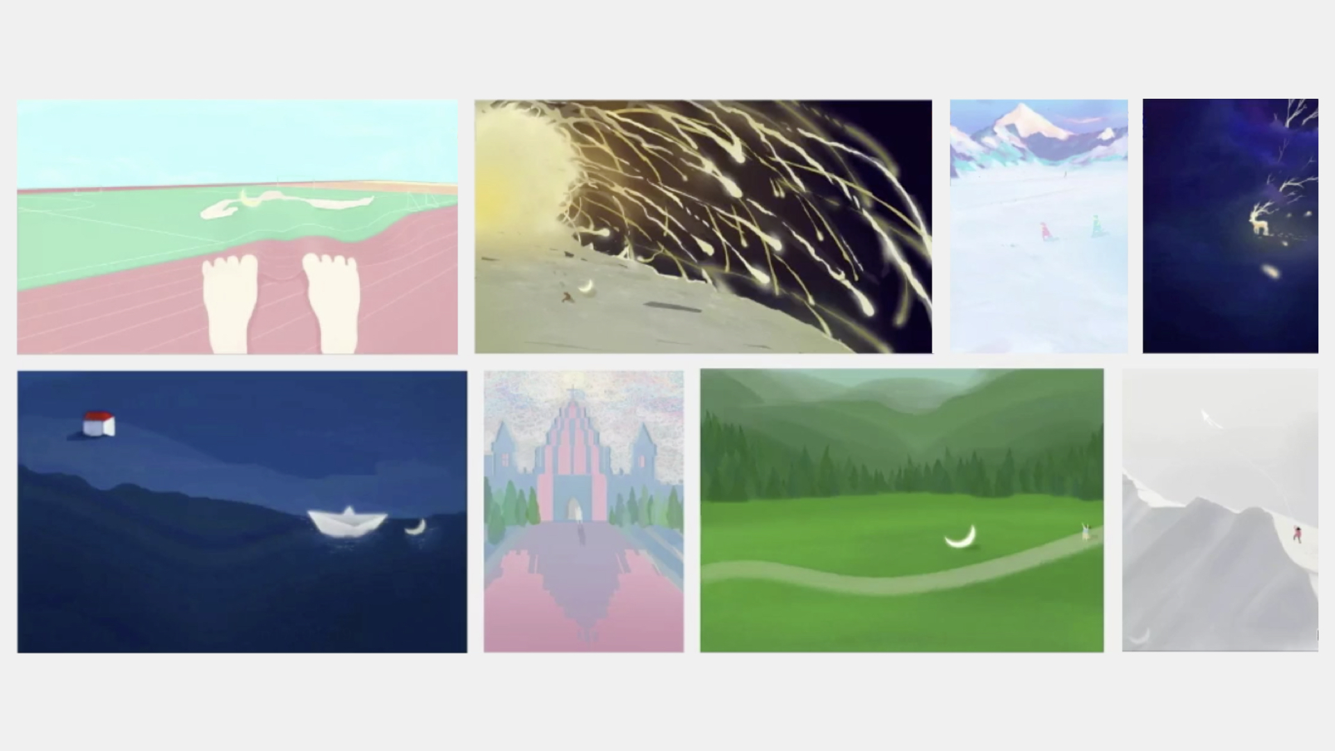 这是最早期的作品,用的是非常简单的技法,但值得注意的是插画师添加的一些小灵感,例如,雪山上放风筝的人、落在草地上的月亮,都是插画师想象力的发挥。