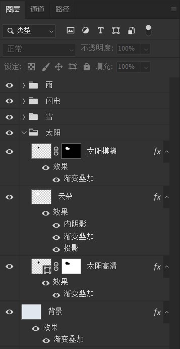 这一张图是在Behance上找到的,自己用PS对着练习的,仔细分析这张图,把它拆成几个部分,实现起来并不难。这里面主要是复制一层云后面的图案放到最上面并添加高斯模糊,再用云的形状加蒙版,隐藏掉下面的图案部分。最下面的图案也添加一层云的形状蒙版,来隐藏到上面的部分。这样一个天气基本三个图层就能解决。下面放一张PS图层给大家看一下。部分图层要减弱一些透明度,才会达到这样的效果。