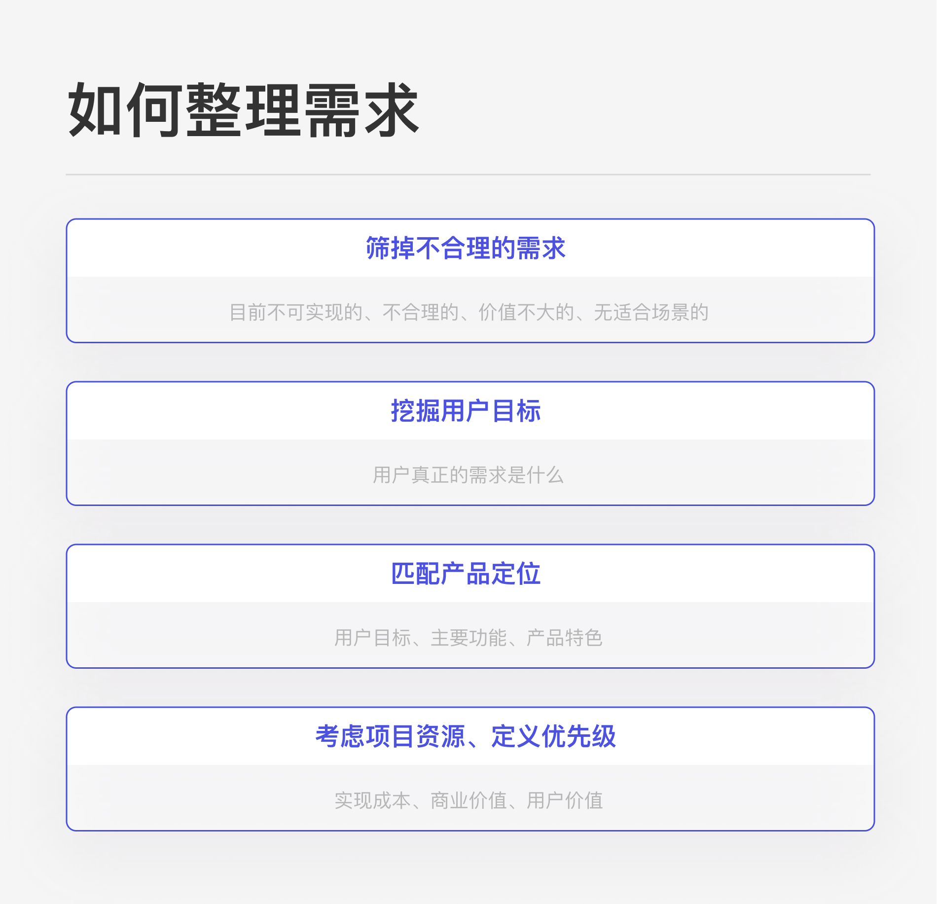 通过上述方式来采集需求,这时候我们会收集到各种各样的需求,由于用户角色和诉求不同,会掺杂大量个性化的诉求,这时候不能完全被用户牵着鼻子走,先把一些不合理的、目前技术不能实现的、明显意义不大的需求过滤掉;其次要通过现象看本质,挖掘用户的真实需求,并且考虑怎么去解决;接下来,进一步分析提炼出的用户真实需求是否符合产品定位,被选中的需求根据匹配程度排列需求优先级;最后考虑实现成本以及收益。