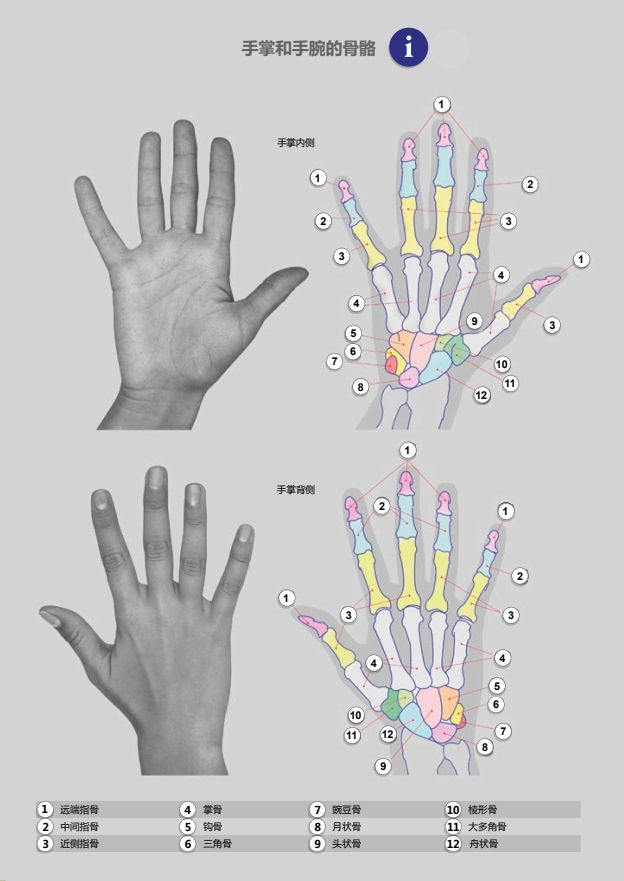 先来看看手掌和手腕的骨头,可以看到除了大拇指有两节外,其余手指均有三节,且每节的长度会递减