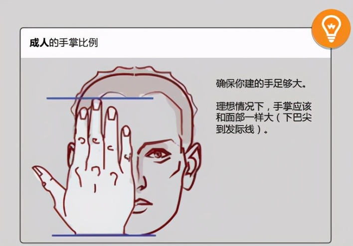 画人体时,控制好比例是最重要的一步,手也是一样的哦,成人的手掌和面部一样大,即为下巴尖到发际线(三庭长度)