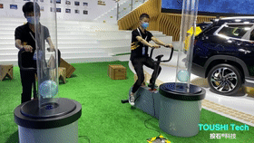 通过遥控器启动,体验者脚踩踏板开始骑车,通过前方的小球开始慢慢飘起,骑行速度越快,小球上升的速度也会越快,最终到达终点。此装置可单独骑行互动体验,也可2台一起竞技比赛互动。