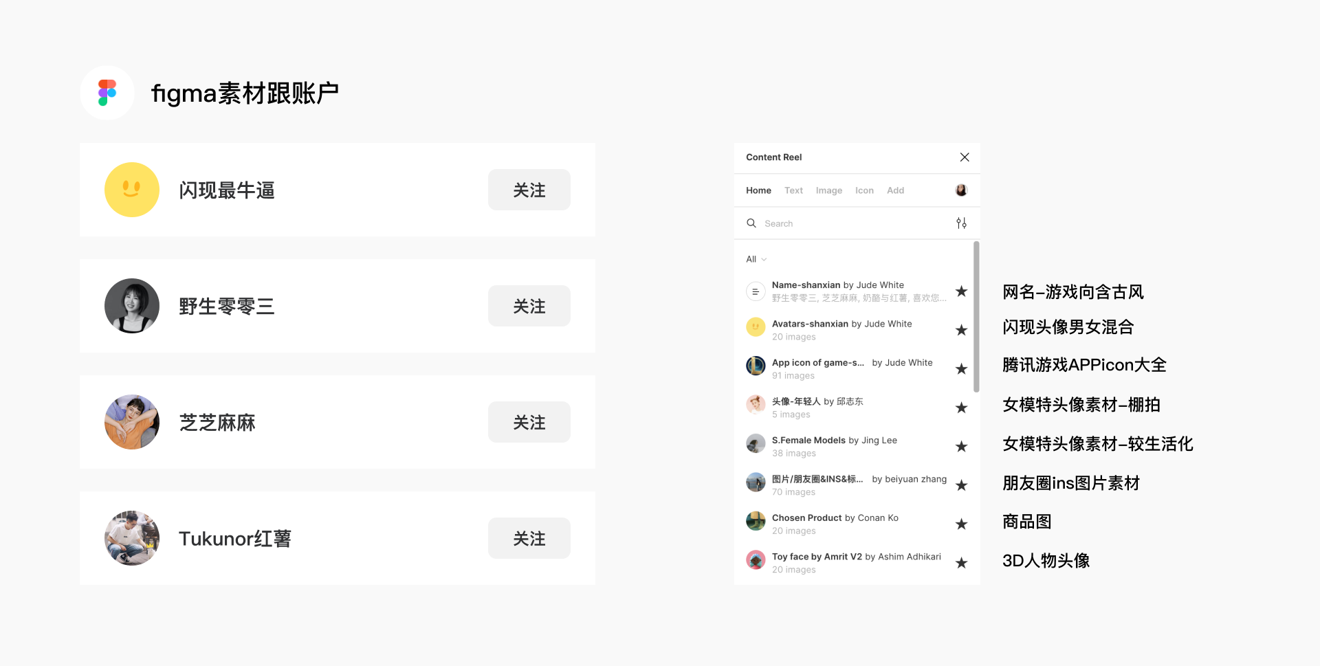 素材则可以用插件「Concent Reel」管理,不同于Sketch需要从本地拉取头像或昵称文本素材,Concent Reel插件里包含着大量的在线素材可供挑选,包括姓名、电子邮件、公司名称、网址、个人资料图片等一系列内容。当然你也可以为团队上传一些素材方便大家使用,这样就可以保证我们的设计稿更加高保真,下图也有一些推荐的素材大家可以收藏使用。