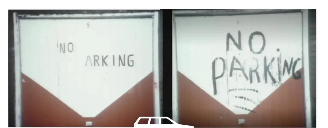 说到文本的编排气质,这让我想到了美国的前卫设计师,大卫卡森在演讲时举的这个例子,我觉得它很适合说明文字和情绪氛围之间的一种联系。大家看上面的这张照片,它是大卫卡森使用傻瓜相机拍的一个路边街景。这是一个车库的大门。为了警告其他车辆不要堵在门口,这个车库的主人特别在门上印上了一排警示文字,内容是“不准停车”。
