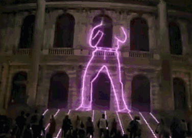 体验者通过齐心协力踩“自行车”发电,楼面上投影出的影像随着发电的过程舞动。