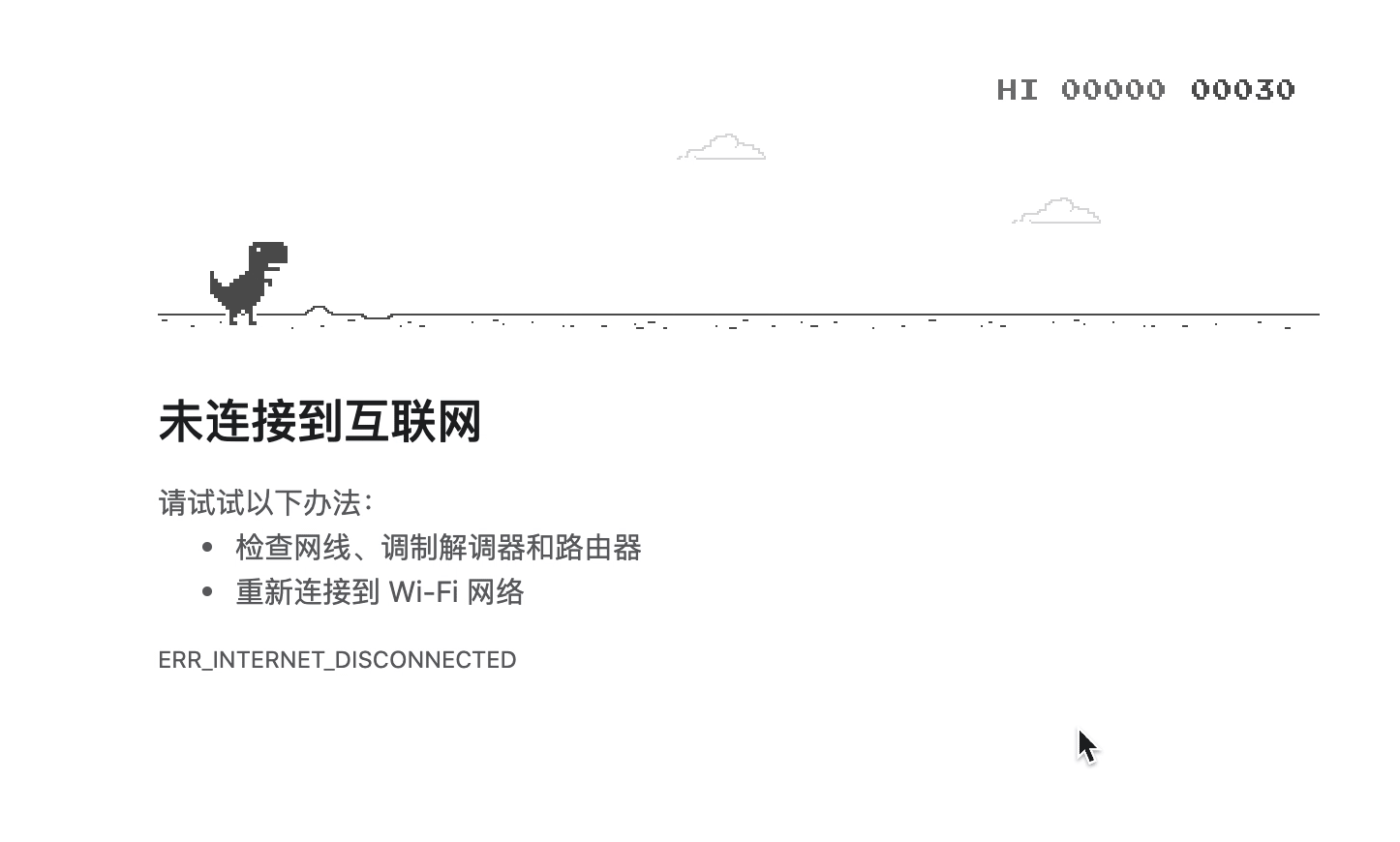 比如:为了让断网等待恢复的用户不会无事可做,Chrome浏览器设置了一个【小恐龙跳跃】游戏,如果你敲击一下空格键,那么小恐龙就会动起来,以此躲避各种障碍物。