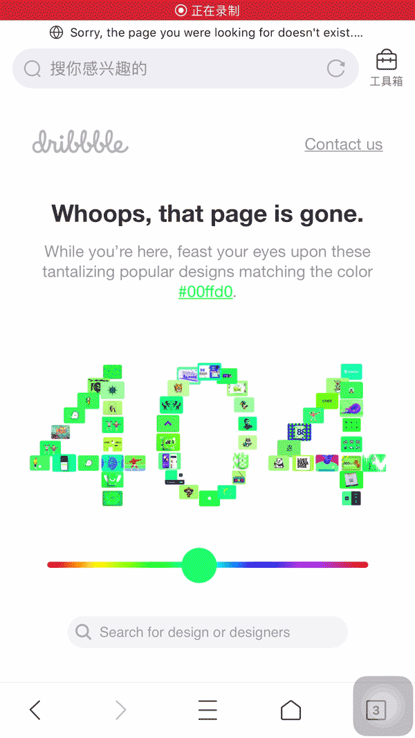 再如,Dribbble的404页面弄了一个【换色游戏】,用户可以自主选择不同色系下的颜色照片,在换色游戏中减轻焦虑感。