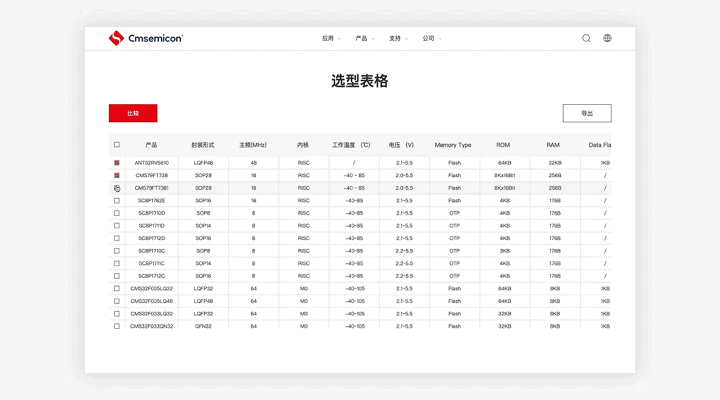 在上面提到过,产品选型的页面有丰富的产品信息提供给用户查阅,分类清晰明确,但是,我们在实际的查阅情景中发现,工程师们需要将这些产品进行信息对比,才能更好判断选择哪款,因此,我们为进一步提升用户体验,增加了市面上这类公司网站基本没有的功能-产品信息对比。工程师朋友不但可以在这里通过搜索、筛选快速找到自己想要的产品,还可以选择多个产品一键对比,对比结果支持导出。