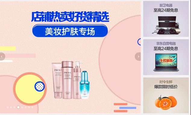 常见的轮播图,下方轮播器展示内容数量,图片会隔一定时间自动轮播,或者通过鼠标悬停/点击查看更多内容。