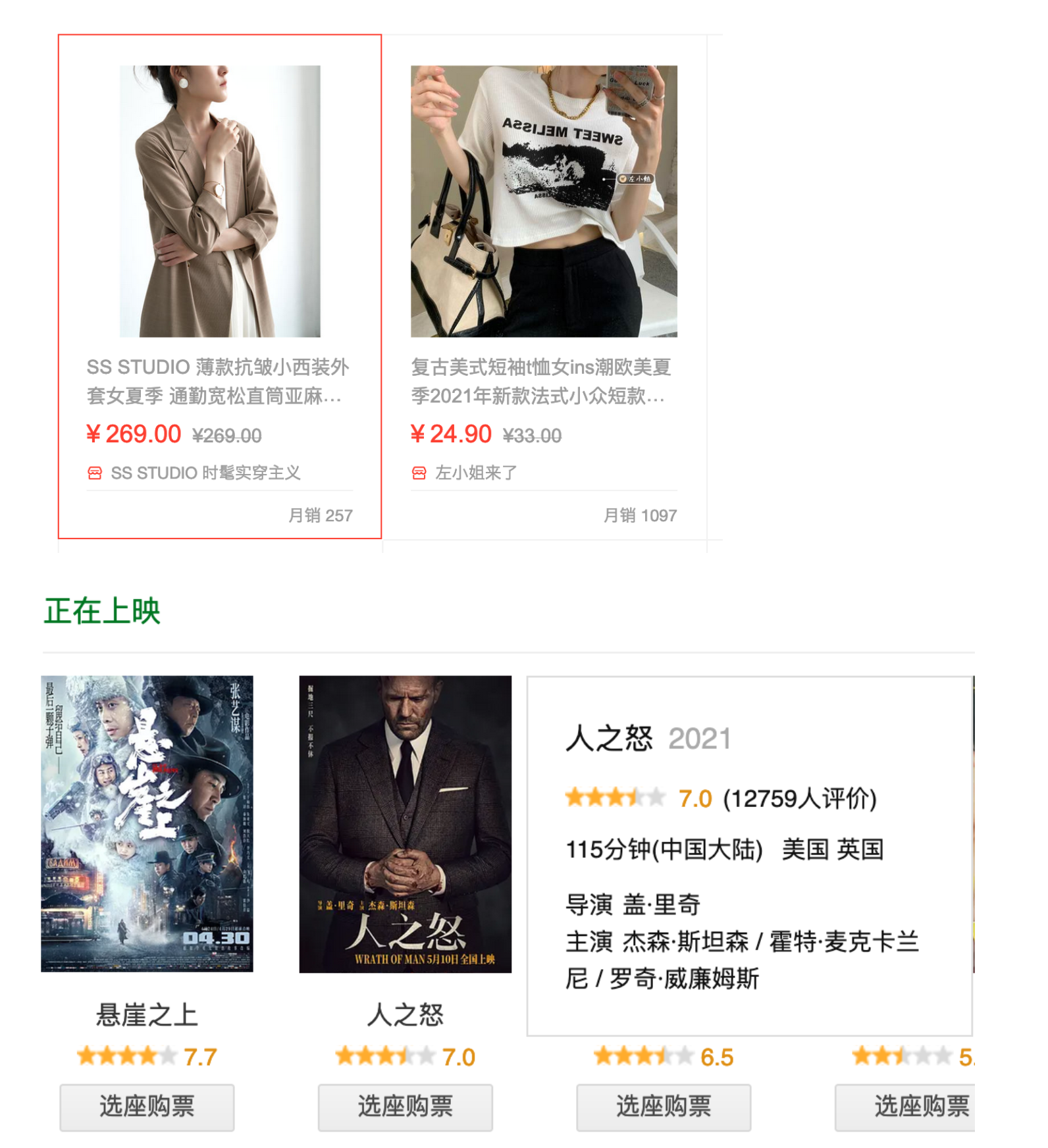 豆瓣电影列表,展示电影宣传画、主题、评分以及购票,当悬停时展示更多内容,提示用户点击进入后将会有更多内容。