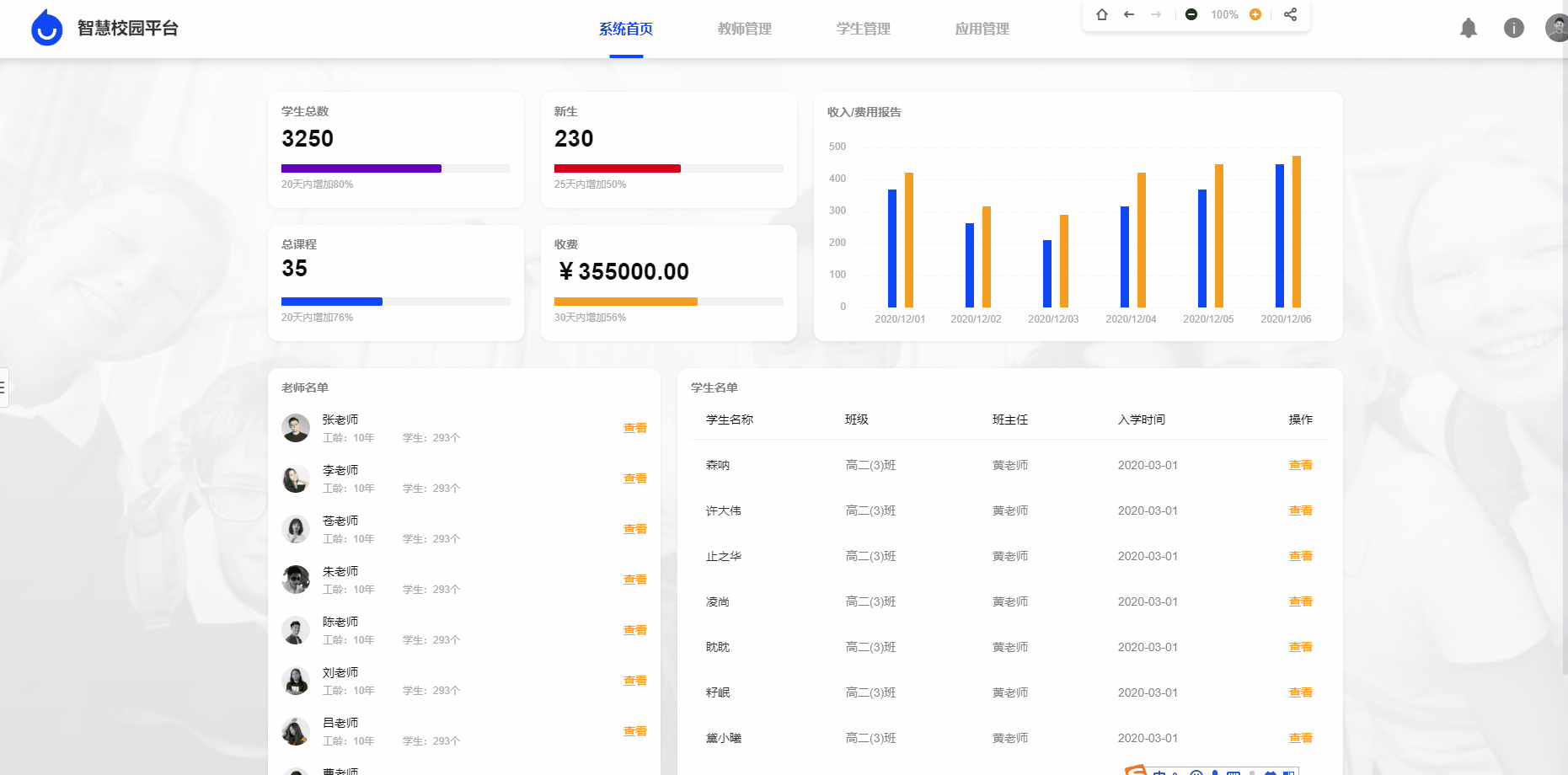 这是一款数字化校园管理平台的高保真设计模板。软件提供一站式数据管理服务,能够管理老师和学生基本信息,以及提供一系列管理应用。例子中展示了可视化数据图,页面表格内容丰富,页面间交互流畅,是非常典型的后台设计范例。