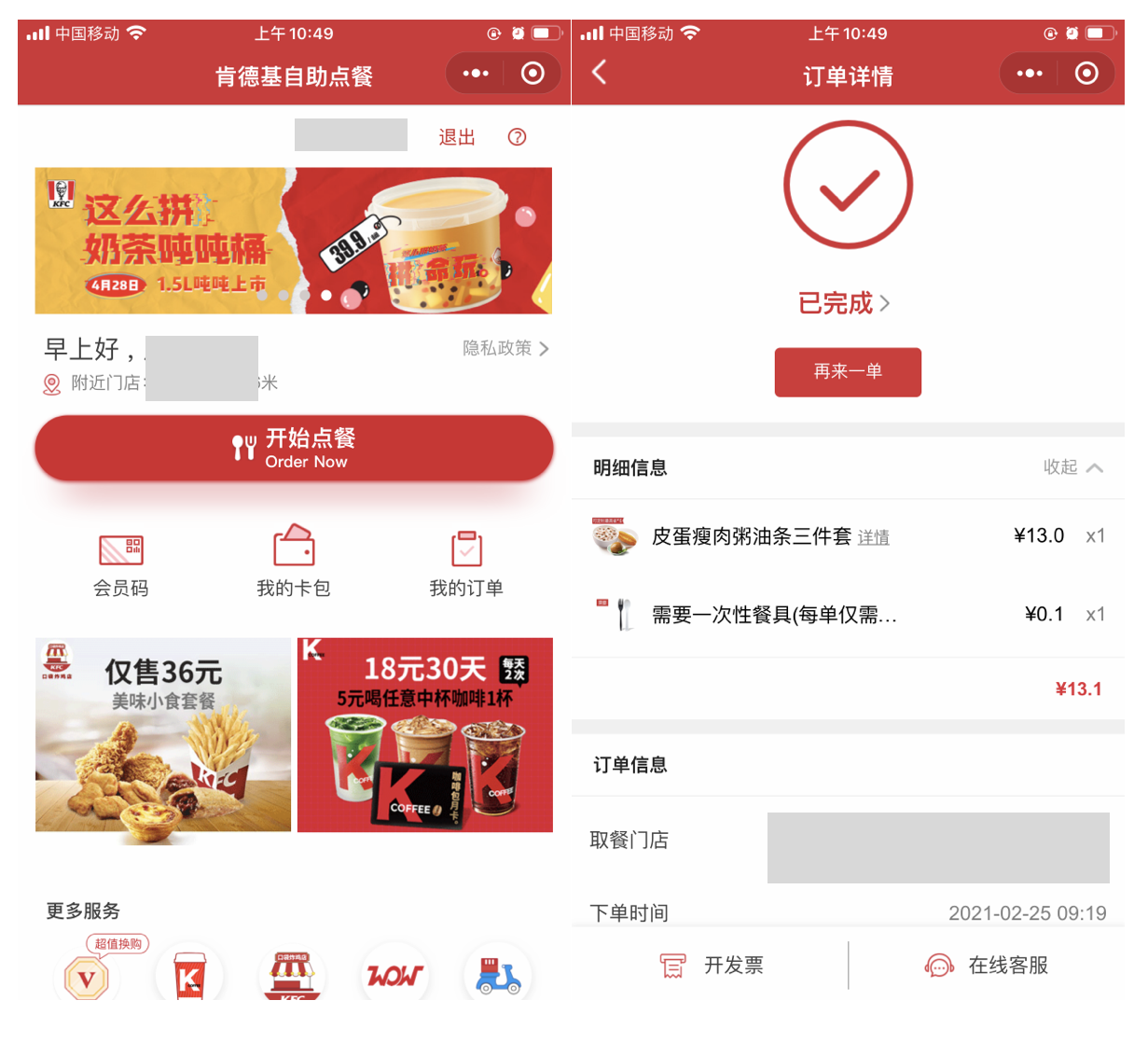 首先,在首页用户可以看到最明确主要的「开始点餐」的button,其次「会员码」「我的卡包」、「我的订单」功能快捷入口为用户提供快速的选择,节约时间成本。