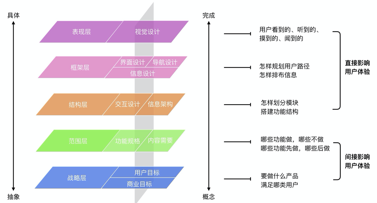 (3)同样我作为用户去使用小程序,我们是否要考虑“用户发现的是哪种体验问题?那么我们是否可以把这个体验进行分类呢?在《用户体验要素》一本书中自下而上的建设用户体验的观点,如果说我们把“体验”放到体验五要素上进行分析。