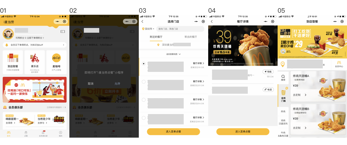 首先,在小程序中搜索麦当劳会出现两个小程序,一个是i麦当劳一个是i麦当劳点餐,但是用户很容易误点进入i麦当劳也就是上面的01界面,进入此界面后,想要找到再来一单发现没有快捷入口,发现在「我的」下滑后有我的订单功能;接着我点击「到店取餐」这个时候就会引流以弹窗的方式(02)提供用户选择「i麦当劳点餐的小程序」,进去后会有选择地址(03),最后才是进入「菜单点单」。