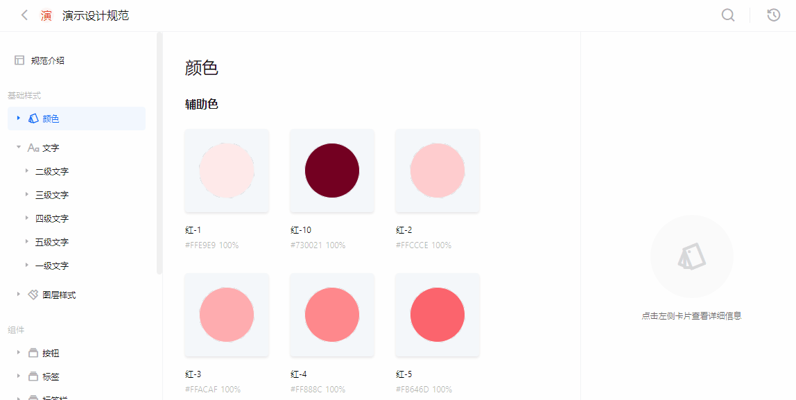 设计规范支持精准搜索。成员可在「设计规范」中,点击右上角的搜索框,输入设计规范的相关信息,则会呈现相关的颜色、文本、图层样式、组件,点击即可跳转到对应的规范目录。