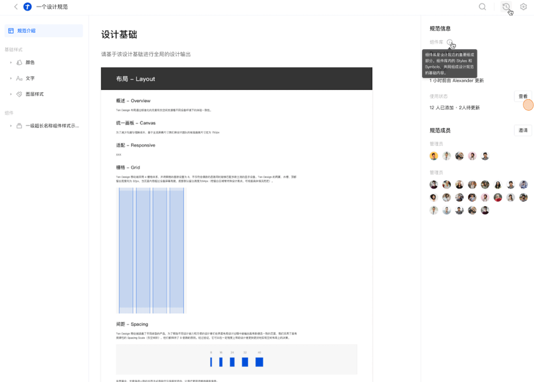 而规范文档就是组件库的使用手册,会详细描述设计的原则、风格指导、组件类型以及组件使用的细节。