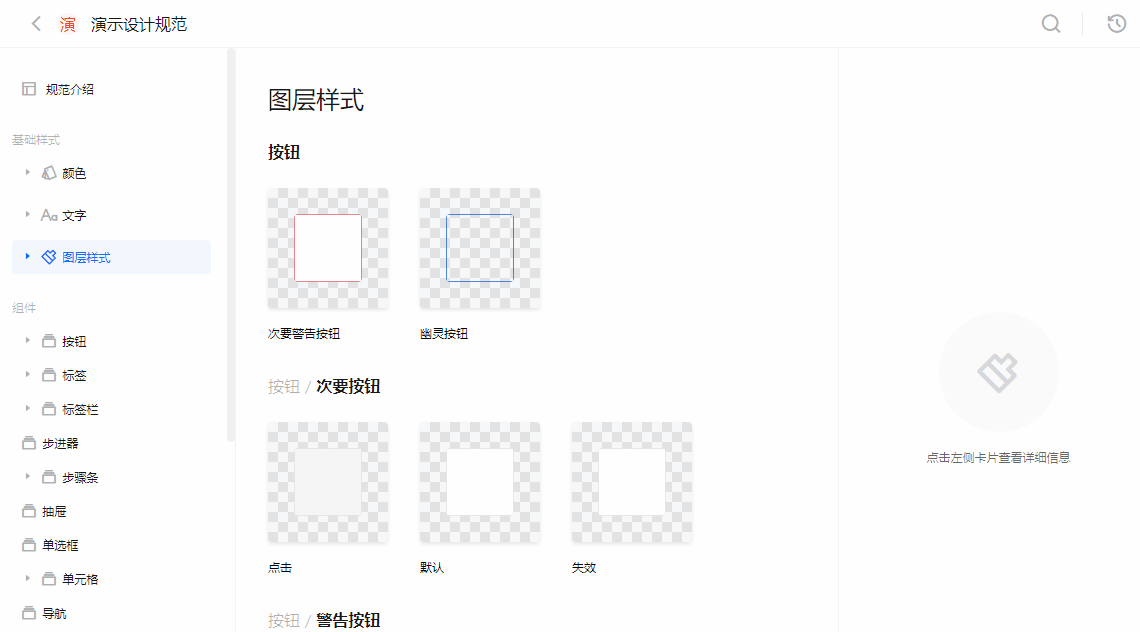 在 CoDesign for Sketch 插件内上传组件库,即可自动生成规范文档,Styles 和 Symbols 将完整展示在文档内,目录结构以 Sketch 内组件的命名方式自动生成。