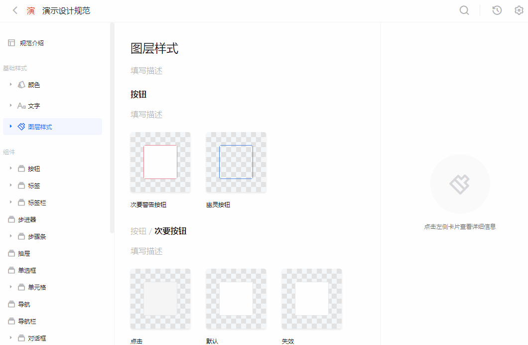 在「设计规范」中,设计师可一览 Styles 跟 Symbols 的样式效果。点击「添加描述」,还可补充该 Styles 跟 Symbols 的使用描述,保证团队设计的一致性。