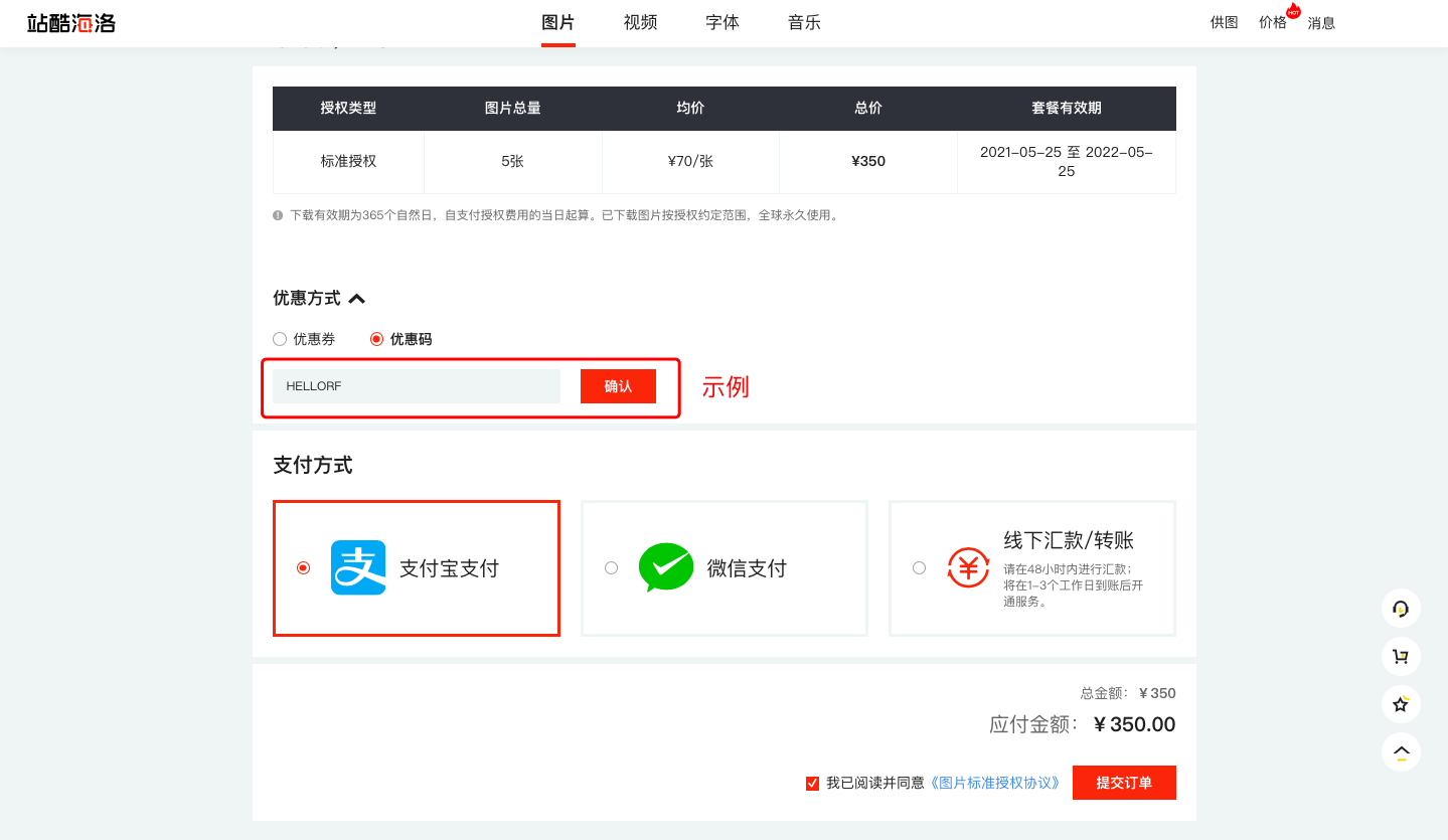 点击「立即购买」后,展开「优惠方式」选项卡,选择「优惠码」