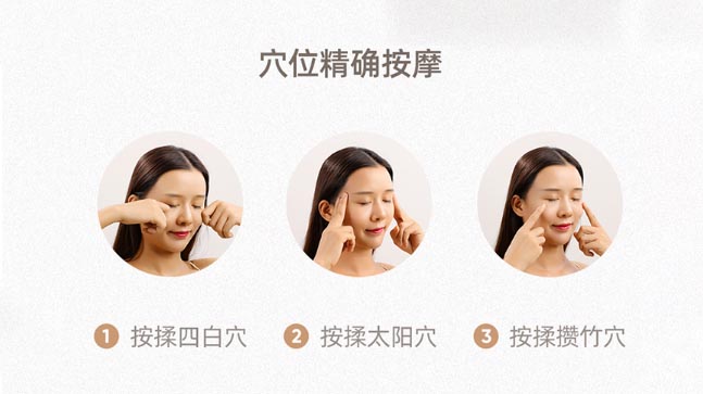 精准按揉太阳穴、攒竹穴、四白穴等穴位。多种按摩手法结合于一体,加速血液循环,缓解双眼疲劳。