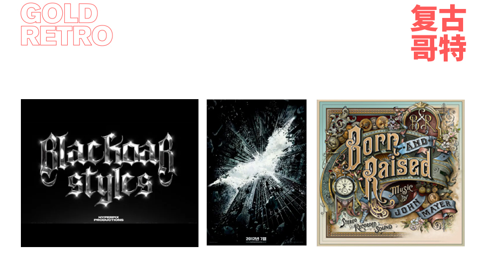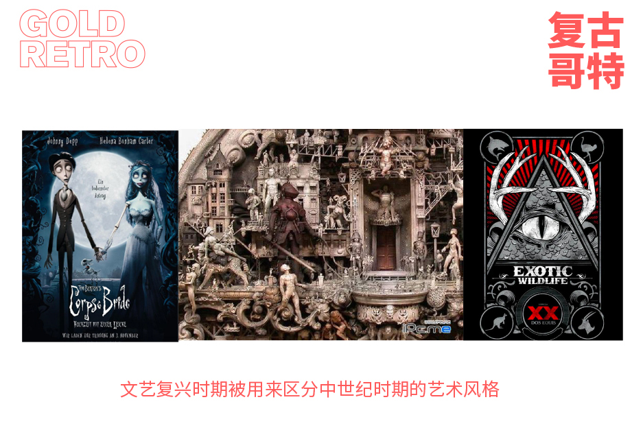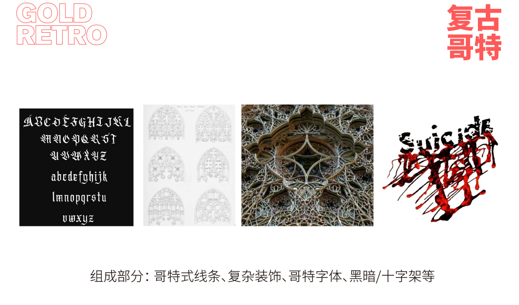 以死亡、颓废、古堡、吸血鬼、蝙蝠、红玫瑰、十字架、建筑、哥特式等为标志性元素,由于本身存在的黑暗特质,色彩及元素不便于商业化,但其哥特的字体却被大量使用。