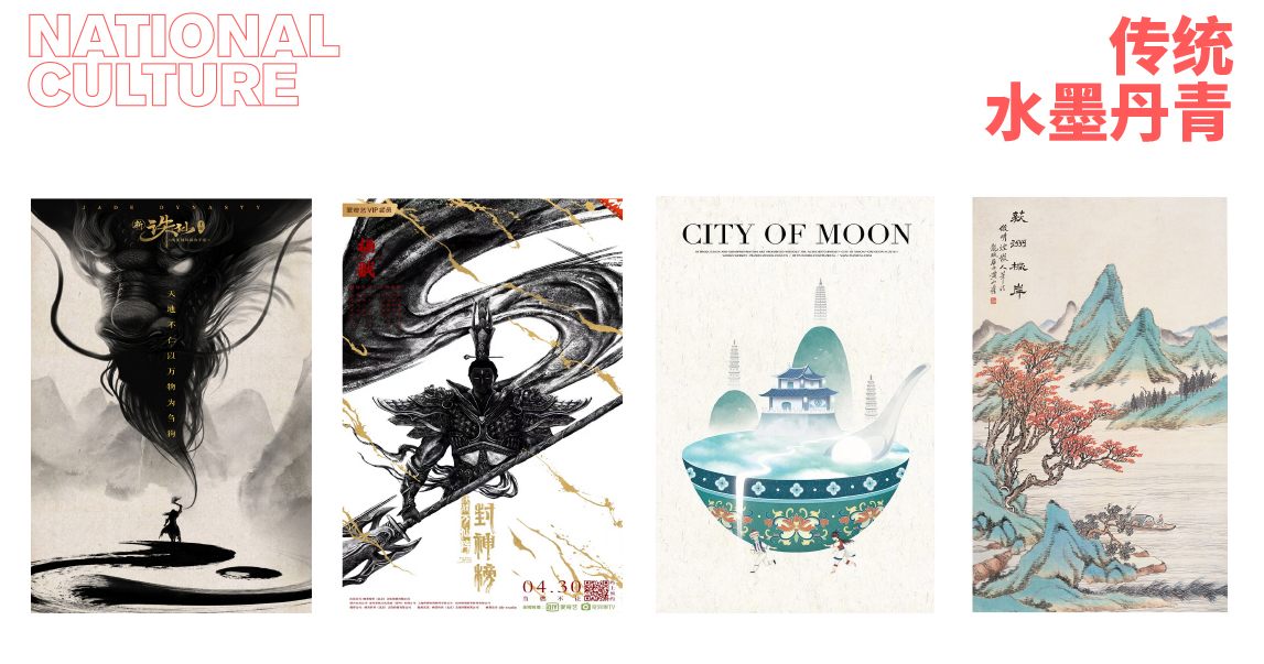 中国传统绘画以笔法为主导,充分发挥墨法的功能。墨的浓淡变化就是色的层次变化,其泼墨与挥洒的笔墨之间流淌着豪迈和情绪化的特质,并且百试不爽,你可以把今年电影海报拿出来看下,10张有5张都是毛笔字体或者水墨类型的。