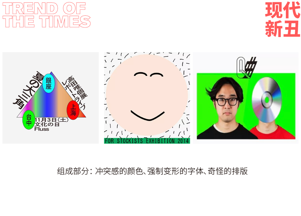 有冲突感的颜色、强制变形的字体,还有故意的印刷偏差和奇怪的排版。