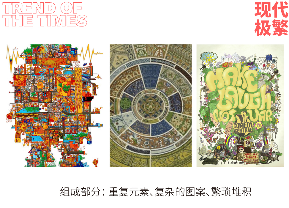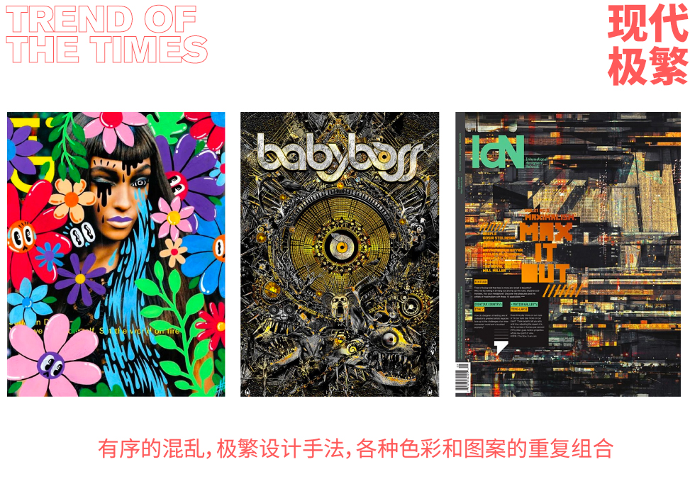 极繁主义,平面设计风格繁琐、华丽的设计风格,运用大胆的颜色,尝试各种复杂的图案,构建迷幻主题。