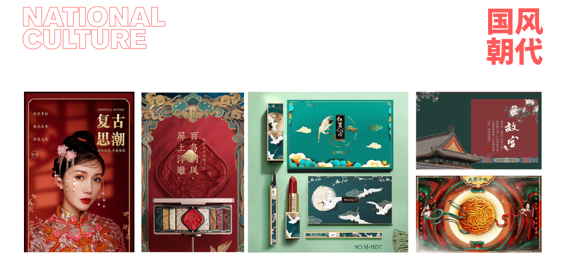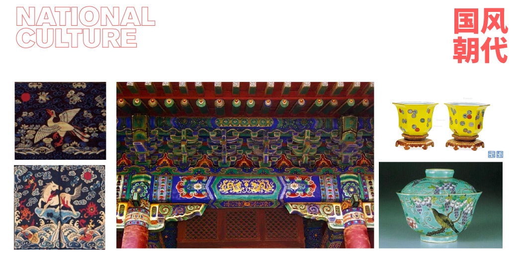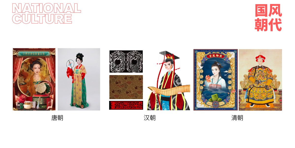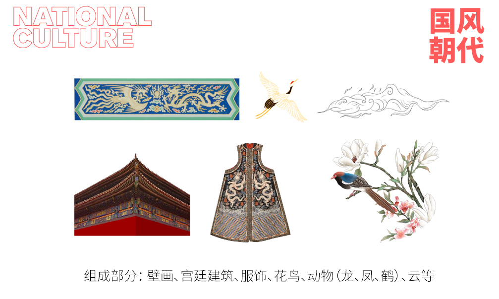 朝代组成的部分,如壁画、宫廷建筑、服侍、花鸟、动物(比如龙、凤、鹤)、祥云等等。这里我要补充的是很多人一说这个宫廷风,就联想到了清朝的紫禁城,这其实不是完全的,只是说清朝整个建筑和图案性的颜色比较鲜艳,更适合现代化的融合,但其实如果你想展现不一样国风的话,应该是将朝代的特质多去了解。