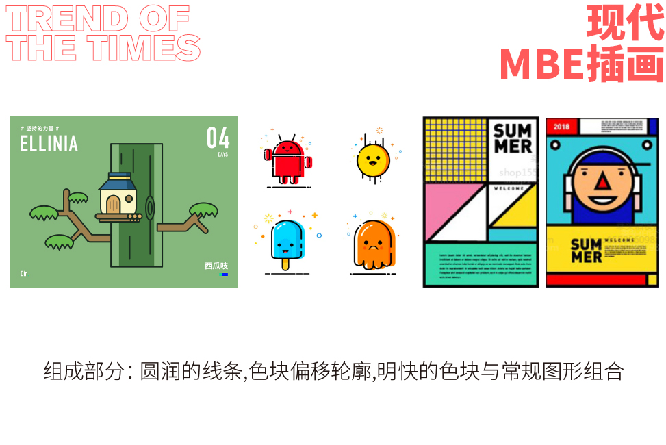 填色方面的特点非常明显,填色的色块要偏移原有轮廓一些,以此来塑造高光和阴影效果,其实这个风格跟孟菲斯的手法是非常接近的。