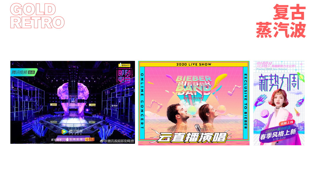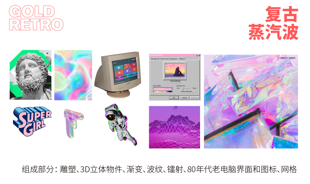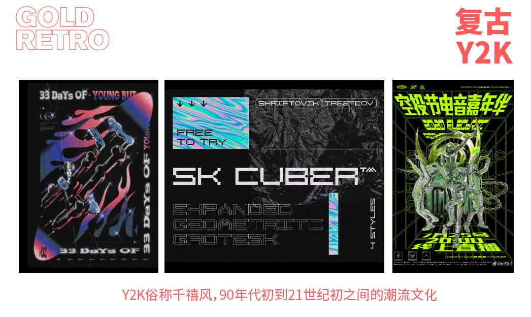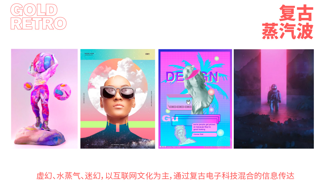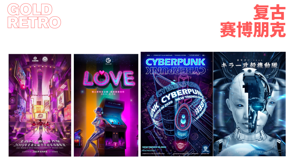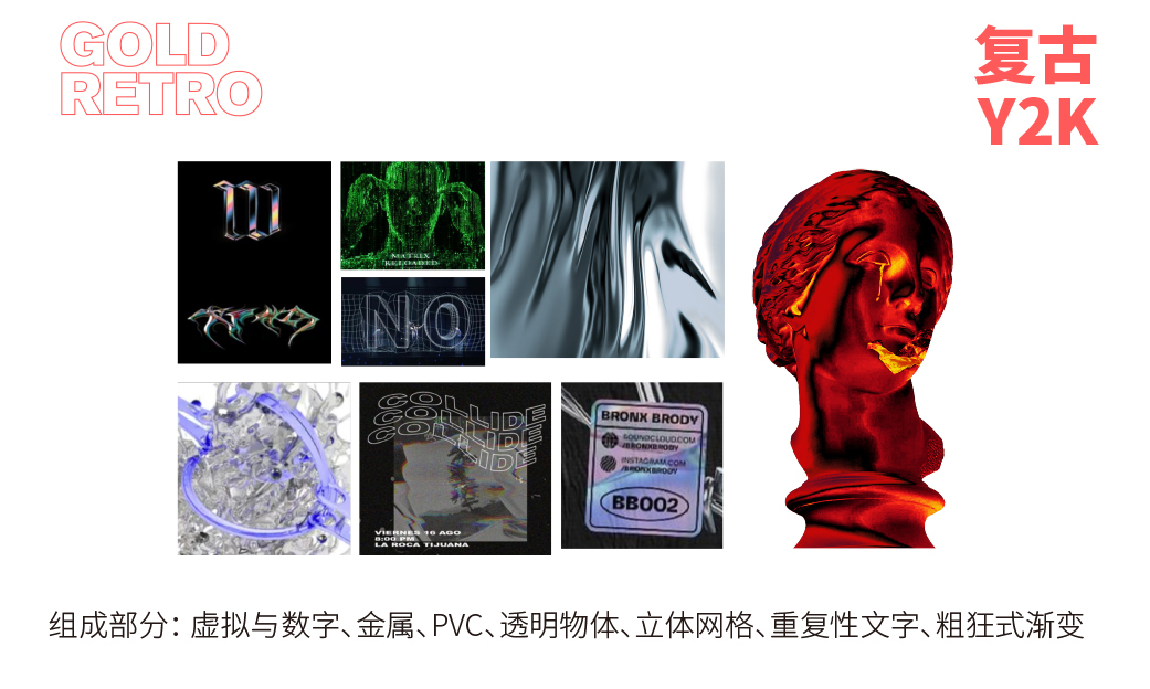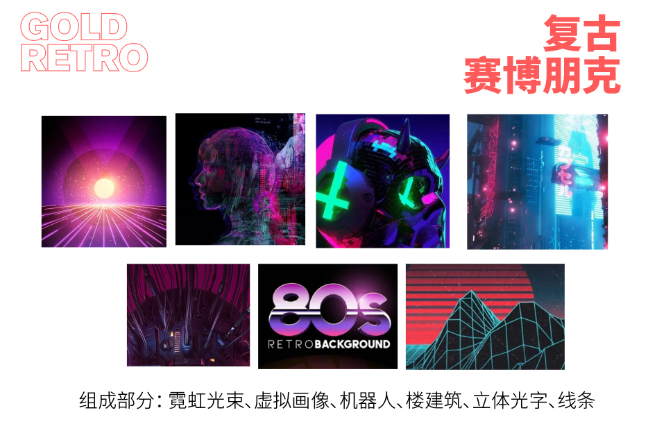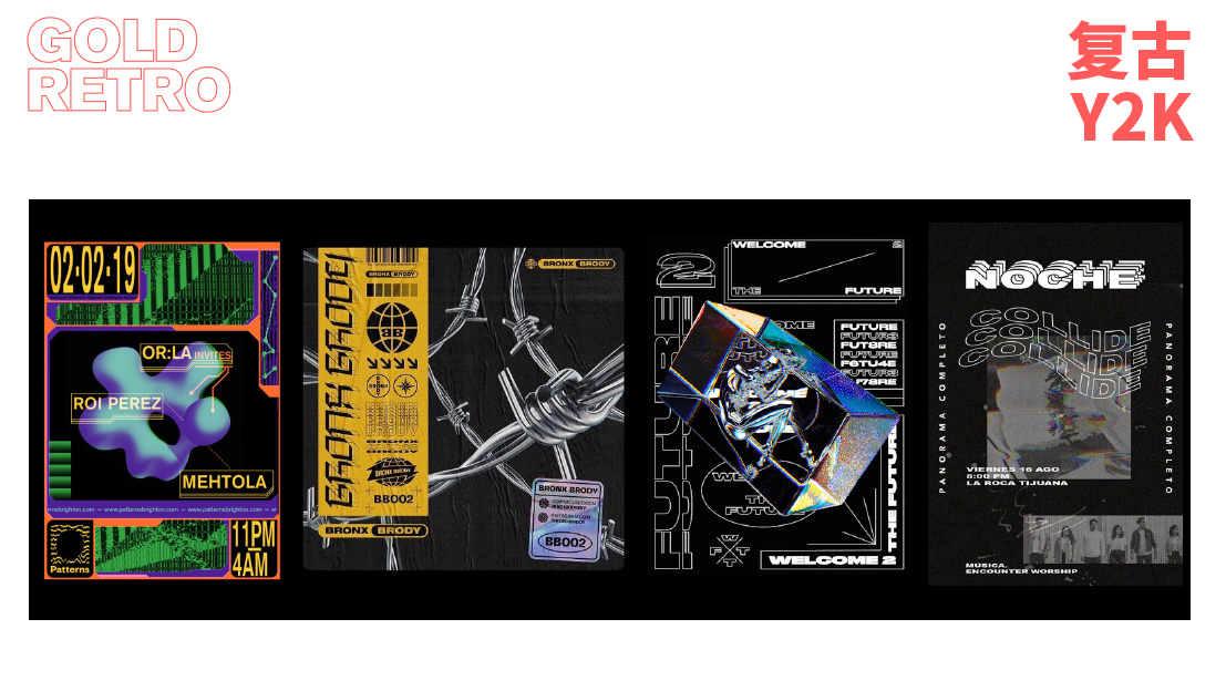 风格经常出现技术不成熟的科幻场景、复古与未来感。围绕未来元素、夸张亮色、金属、科技、透明、PVC。但是你可以找找2000年的画风,纯画风放到现在其实是不够商业化的,需要我们用现代化的设计和其他风格进行一定的融合才可以。