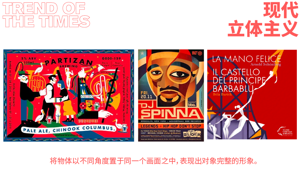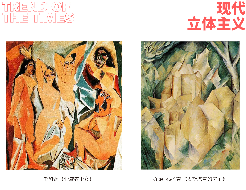 立体主义,将物体以不同角度置于同一个画面之中,表现出对象完整的形象。