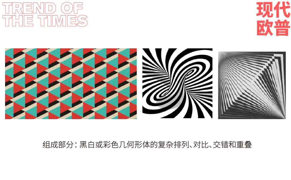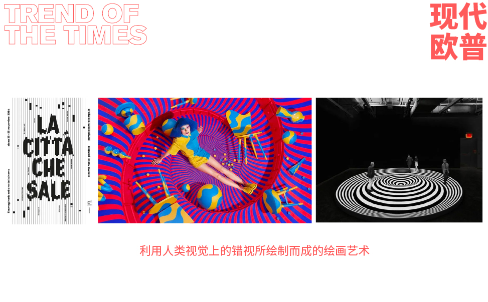 欧普平面设计风格就是要通过设计达到一种视知觉的运动感和闪烁感,使视神经在与画面图形的接触过程中产生令人眩晕的光效应现象与视幻效果。