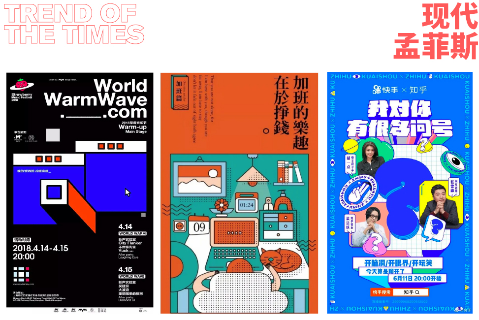 国风的现代风是舍弃了其他风格中烦琐的图案和形式,因为注重线条和色块拼合的使用,勾描形象而不藻修饰与渲染烘托的画法,配以古朴配色和纹理,呈现出最具中国传统特色的国潮,大量被用到插画与设计融合的海报中。