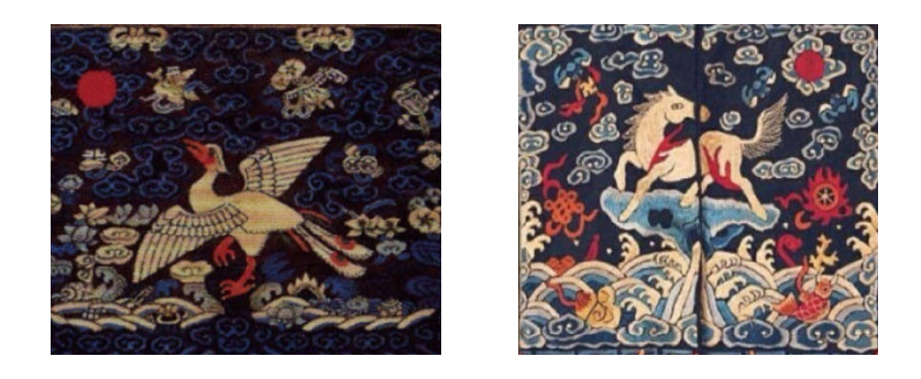 比如上面的清代文官官服九品练雀,下面的是清代武官九品海马,代表着不同的官品阶位。