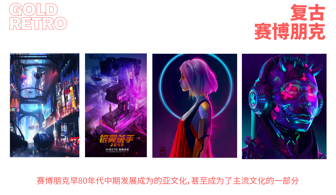 赛博朋克在设计上的表现形式往往以蓝紫的暗冷色调为主,搭配霓虹光感的对比色,用错位,拉伸,扭曲等故障感图形体现电子科技的未来感,加街道大厦建筑等,很符合现在年轻人标榜自我的价值观。