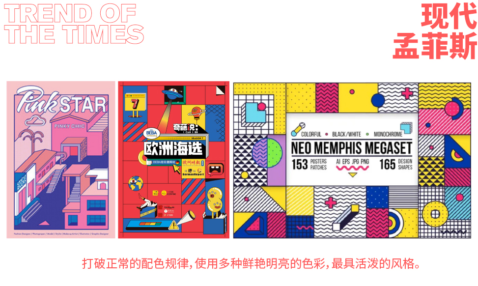 孟菲斯风格打破正常的配色规律,使用多种鲜艳明亮的色彩,构图上大量运用集合线条图案,运用黑色的描边结合直线、波浪、3D图形。
