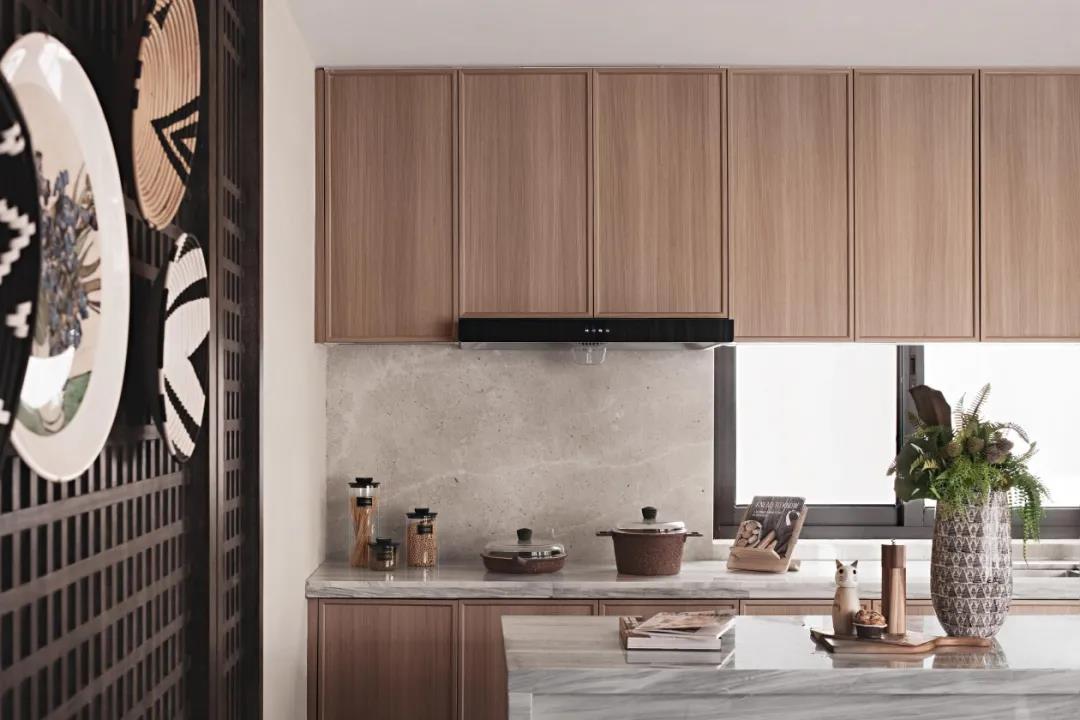 厨房使用的台面由大理石和混凝土相结合制成,定制的木质纹理橱柜,将氛围渲染得格外温馨,这种组合给人一种很新鲜的视觉冲击。