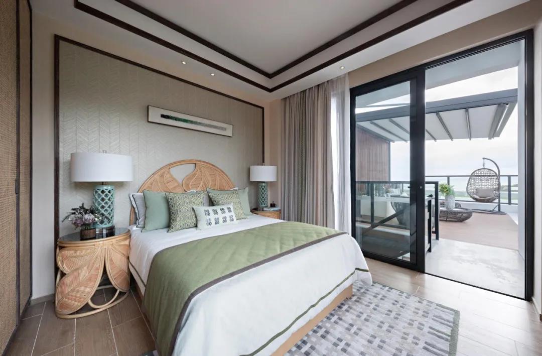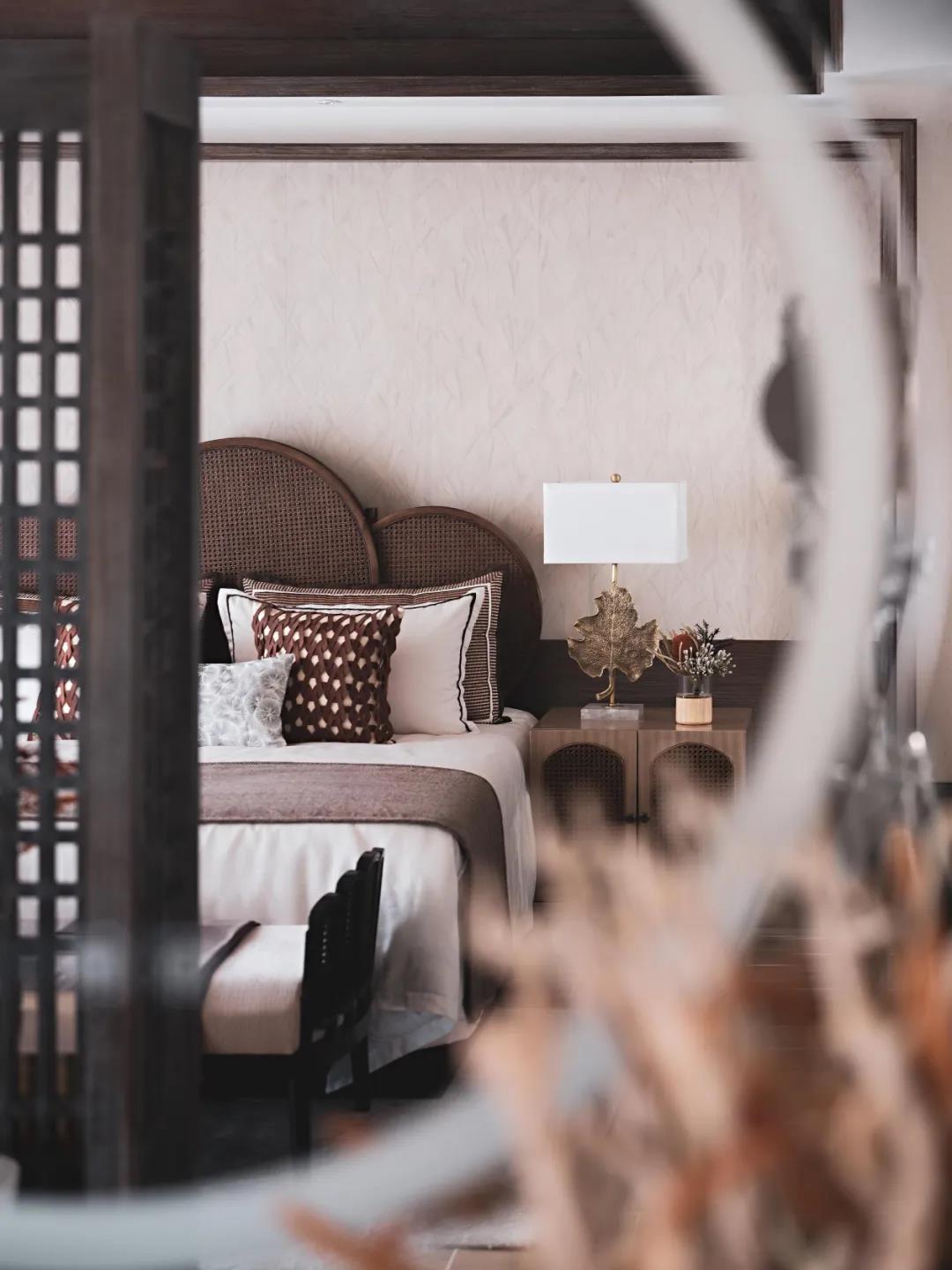 主卧以对称的木结构为主,运用壁纸、实木、藤条以及编织材料等,演绎原始自然的淳朴,营造出浓郁的热带风情。每一个摆件,皆在视觉空间里传达了几分原始的虔诚意味,叫人心安。